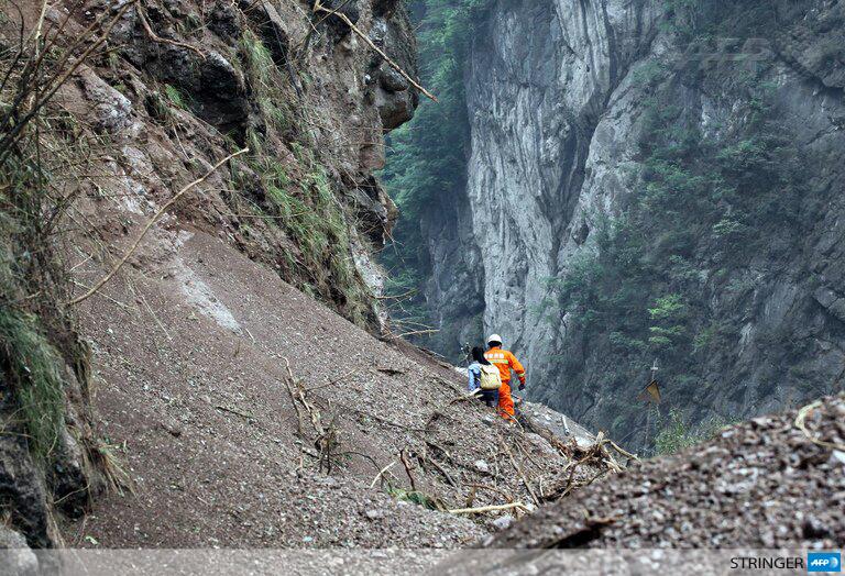 #PHOTO: Survivors and rescuers make their way along a damaged road in China's Sichuan province after an earthquake pic.twitter.com/ojmdhx0NIt